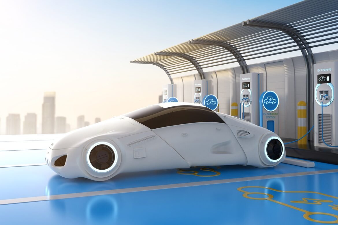 3d rendering driverless car or autonomous car plug in with ev charging station
